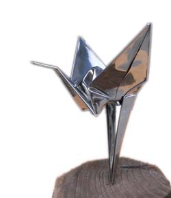 ![]() 折り方は何度も工夫を重ね、普通の折り鶴の倍の時間がかかった。 紙で折った立ち鶴は脚にようじをいれないと立たないが、金属製だけに、しっかりと立つ。 今にも飛び立とうとする瞬間をうまく捉えた、躍動感あふれる作品に仕上がった。 |